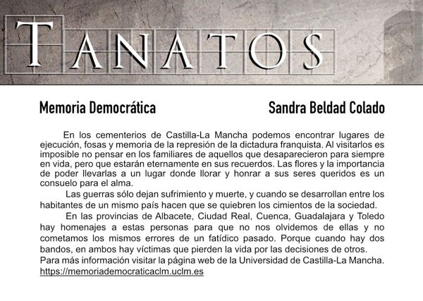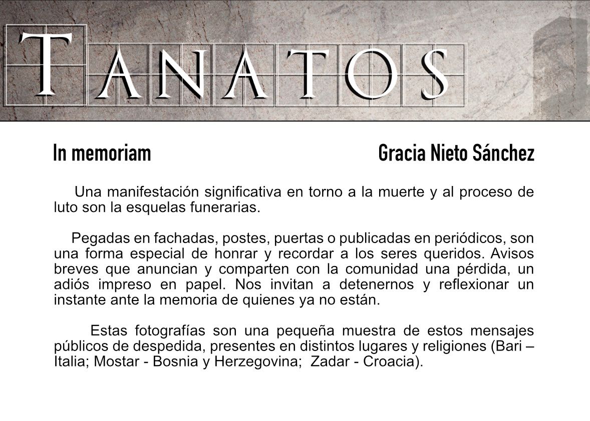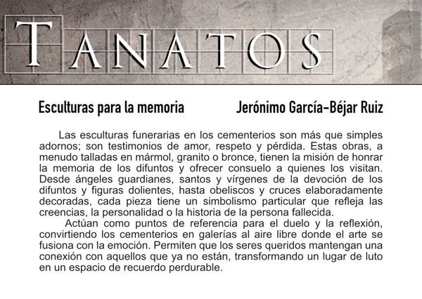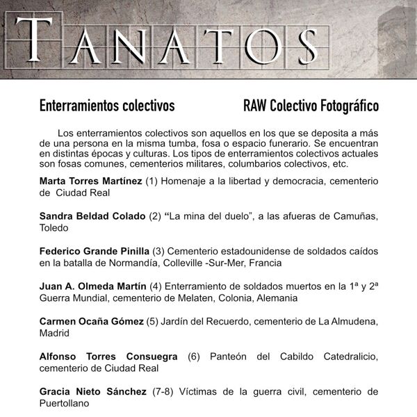“Tánatos” es el nombre que Raw Colectivo Fotográfico ha elegido para esta propuesta expositiva, en la que queremos destacar en imágenes la esencia de los cementerios, como lugares de luz, de continuidad, de encuentro con el pasado o con el futuro, según creencias de cada uno, pero en esencia son lugares que transcienden a la propia muerte como protagonista del espacio, para hablarnos y destacarnos arquitecturas, creencias y la condición del ser humano.