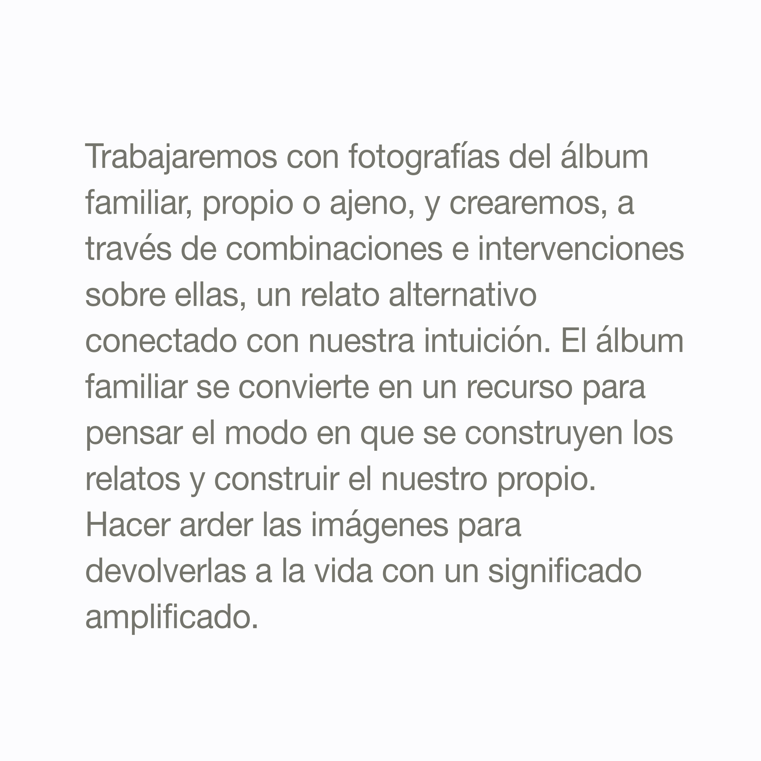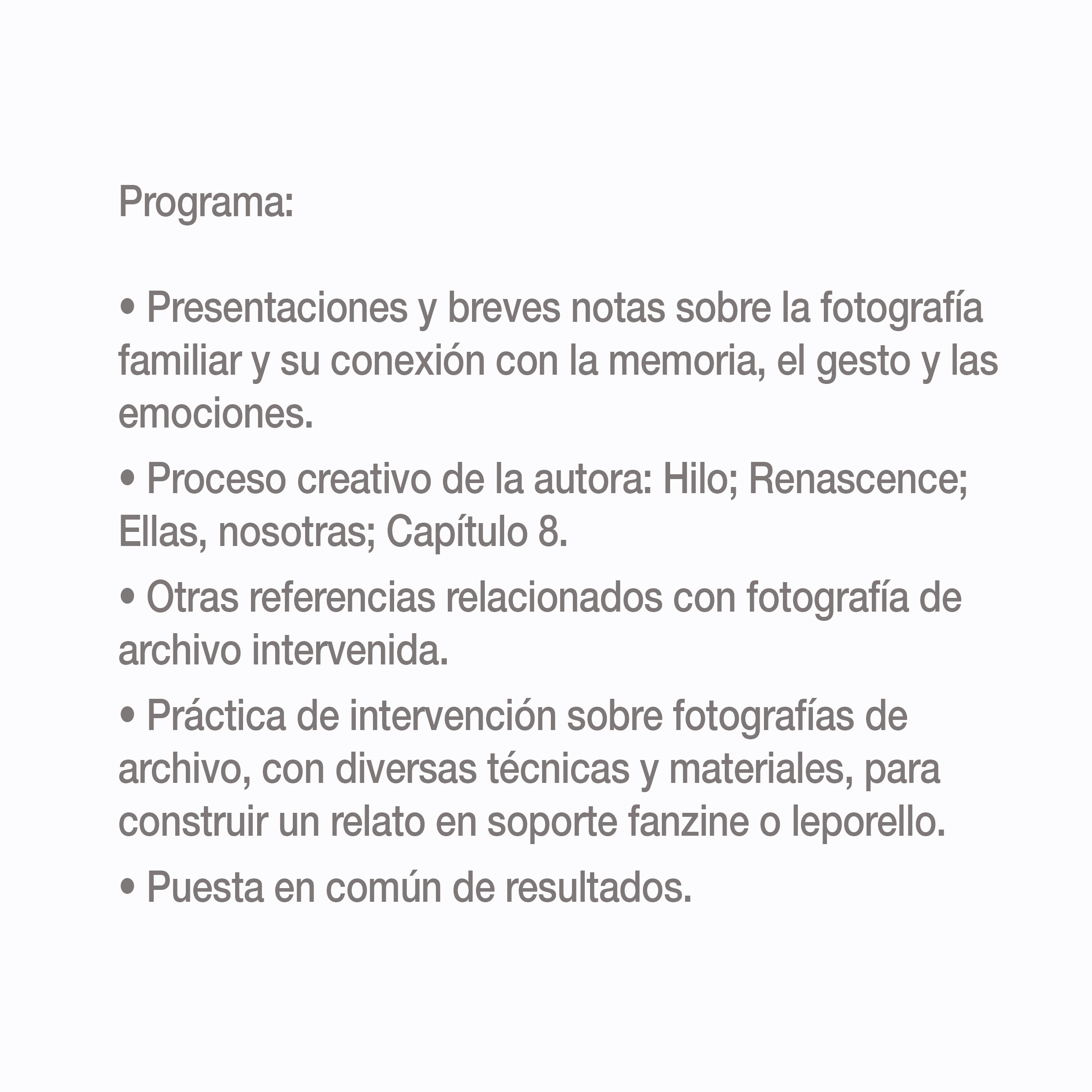 Tenemos muy buenas noticias. El próximo 24 de mayo de 2025 -sábado-, viene a visitarnos la fotógrafa y artista Rocío Bueno con su taller de fotografía experimental "Más allá del álbum familiar". No os lo podéis perder porque al precio de ganga que tiene, se suma que sólo quedan 4 plazas disponibles.
