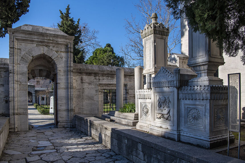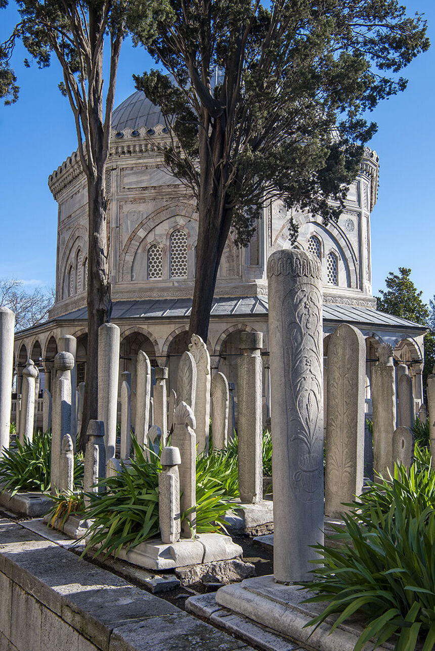 El cementerio anexo a la mezquita de Solimán el Magnífico en Estambul es de tradición islámica, donde la tumba es modesta, generalmente sin ataúd, cubierta con tierra y piedras, mirando hacia La Meca.