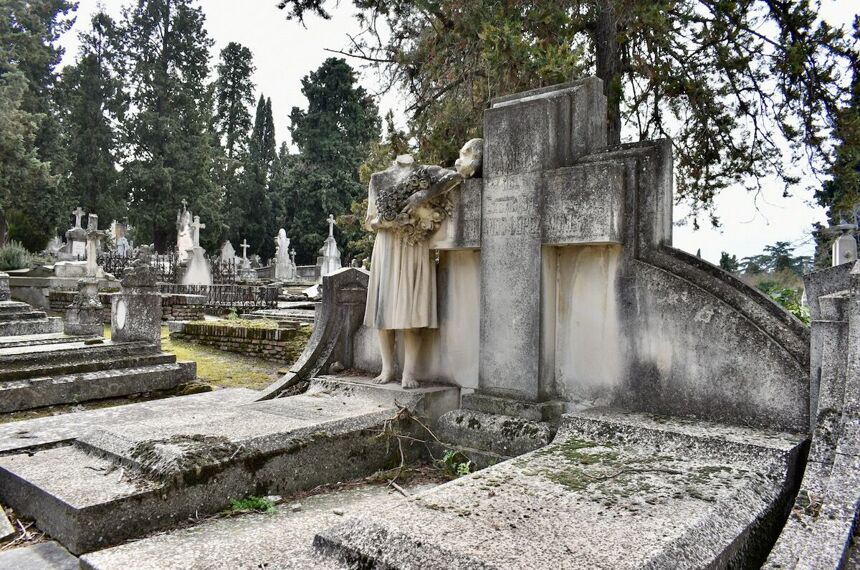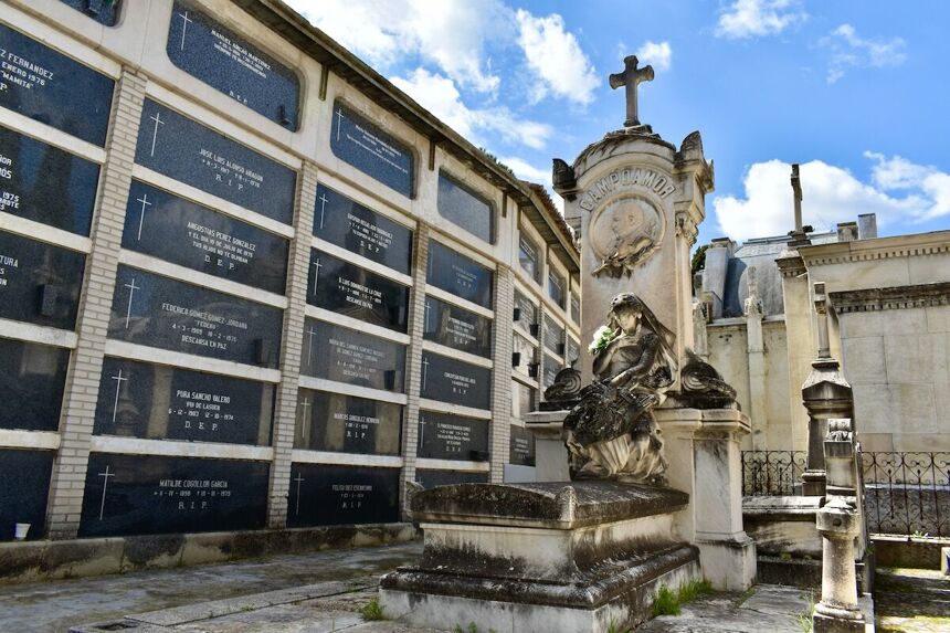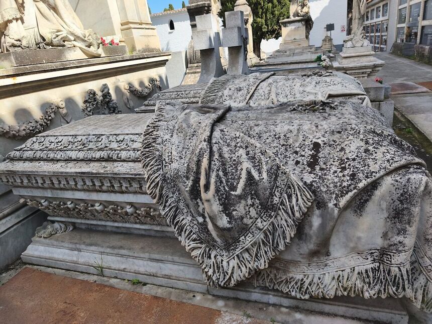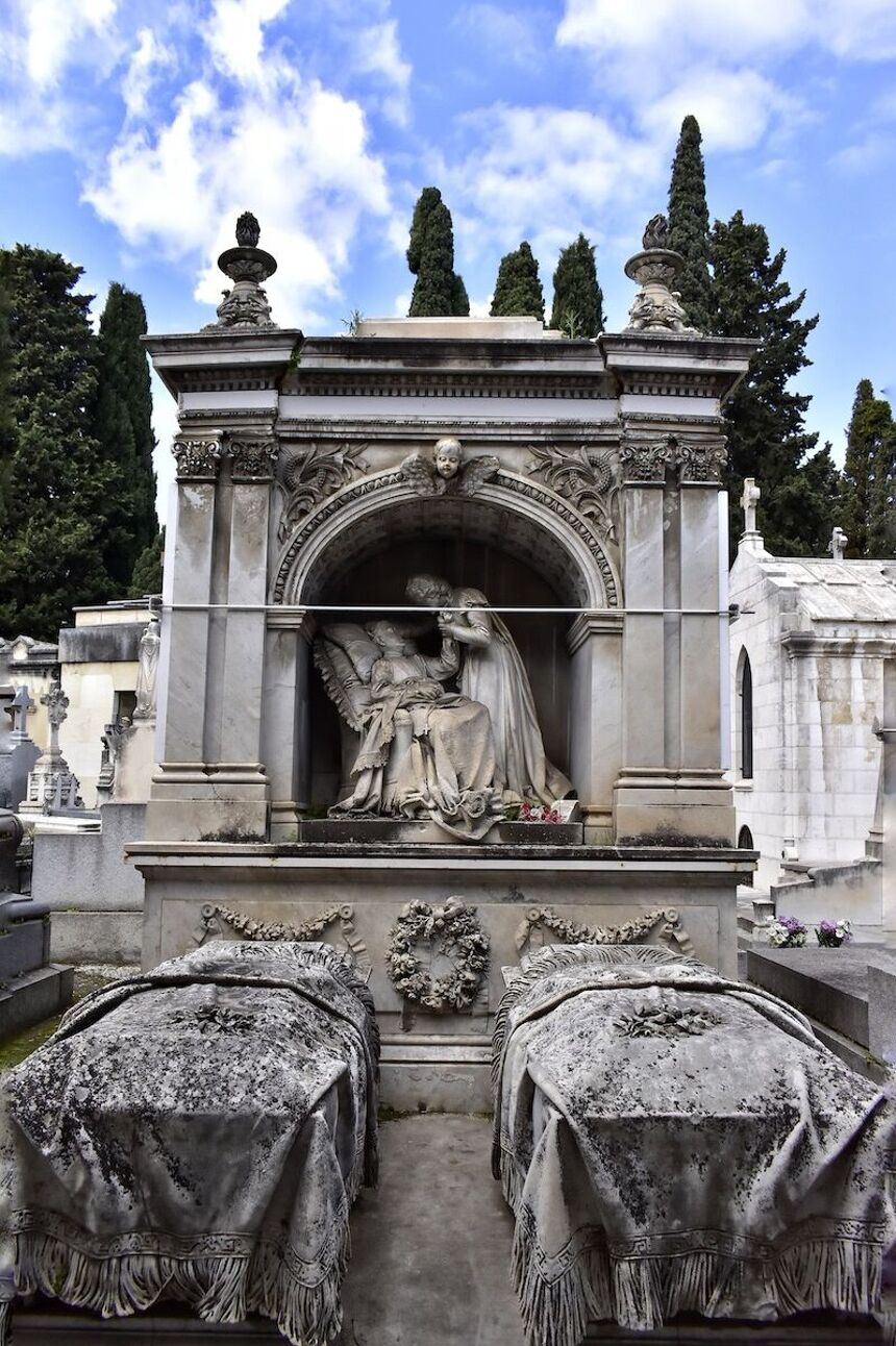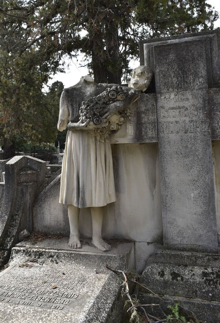 Por desgracia, no parece existir descendencia, y el conjunto presenta graves problemas estructurales. En la parte alta de toda esa pared figuraba una gran cruz con una inscripción que ponía “Familia de Fernando….”, que ya no existe, ha desaparecido en estos últimos años, y a veces es fácil encontrar trocitos de cornisa caídos a su alrededor, que con mimo los empleados y guías del cementerio van guardando por si pudieran recuperarse…. El cementerio últimamente ha tenido que intervenir colocando una especie de brida metálica a todo el conjunto.