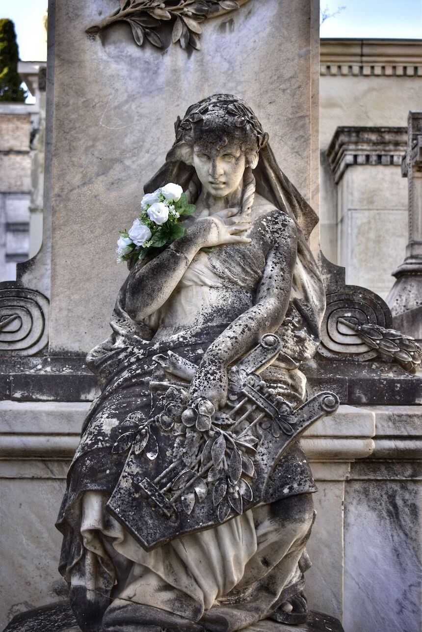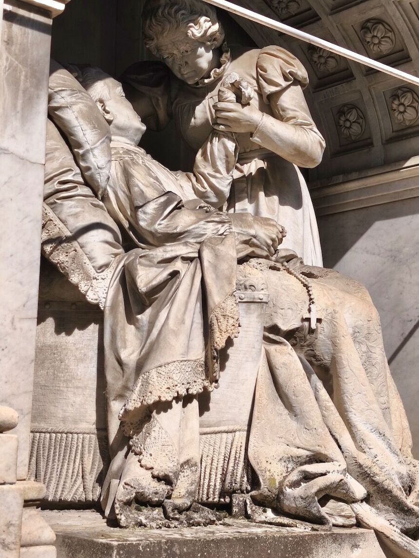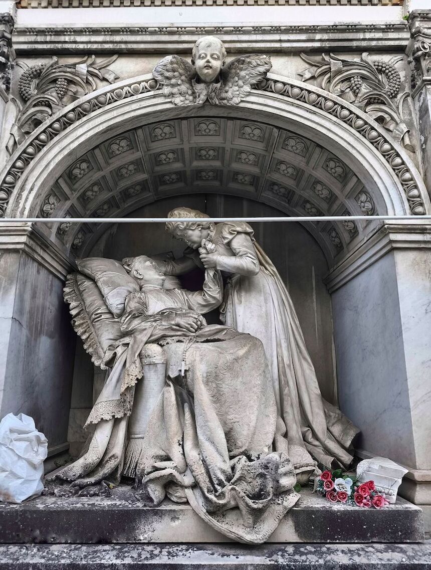 “En el lecho de muerte” es el titulo que descubrí en una publicación del cementerio donde está esta sepultura, sin embargo yo prefiero llamarlo “el acompañamiento” o “Fernando y Andrea”, porque cuando la vi, me resultó tremendamente entrañable ese momento de último aliento, de acompañamiento final, de amor incondicional hasta el ultimo suspiro al lado de alguien….