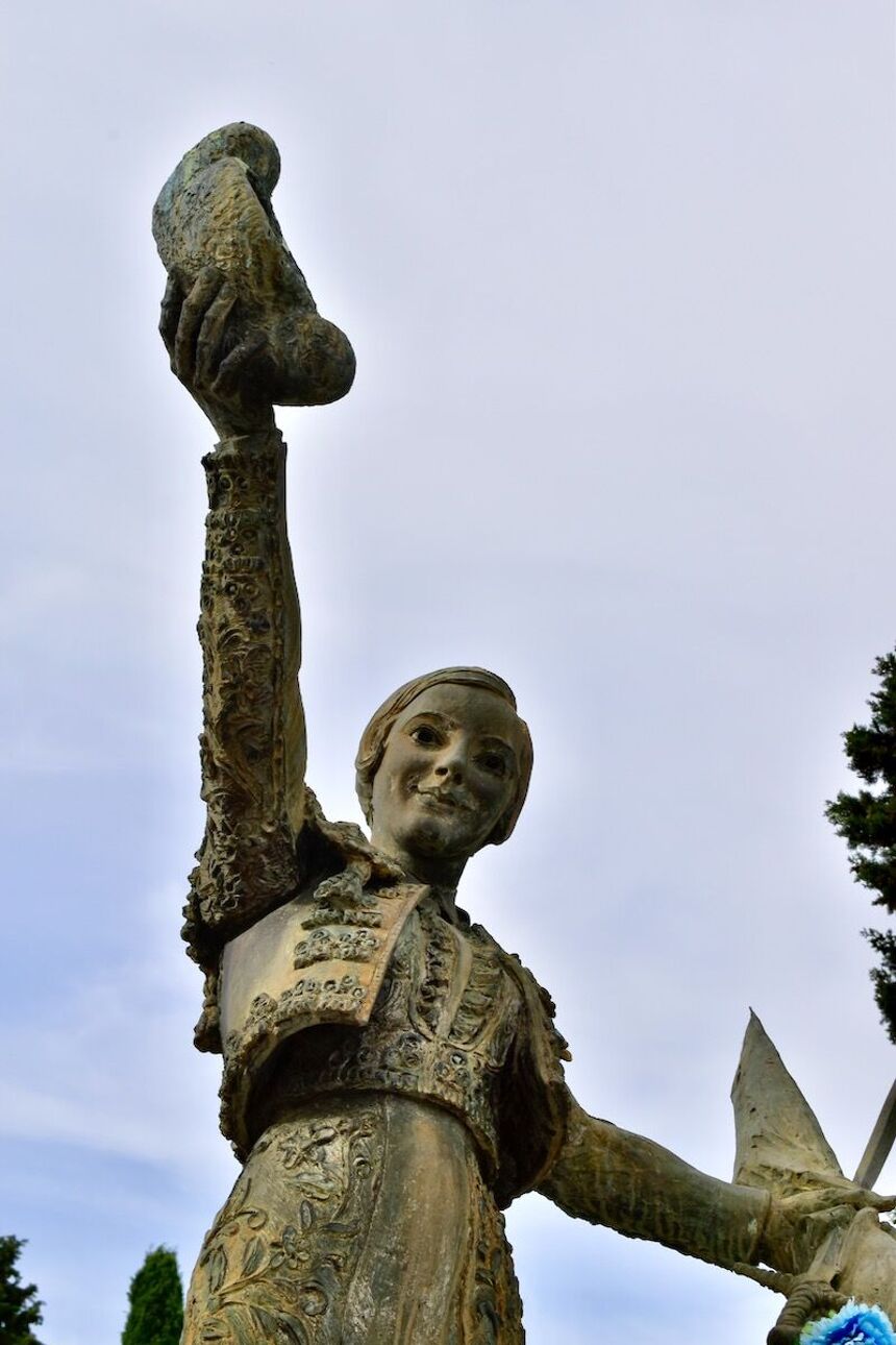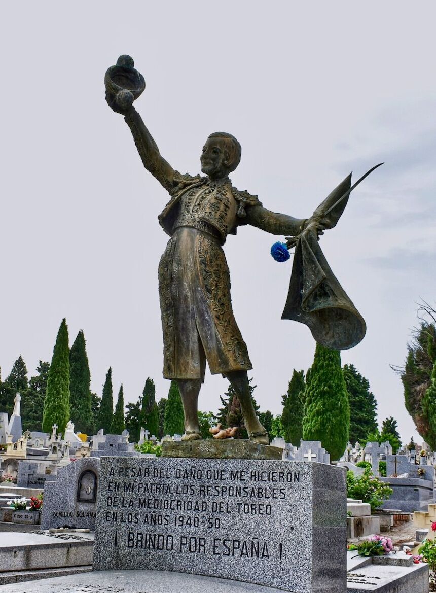 Juana toreaba habitualmente con falda, huyendo de la taleguilla de los toreros y así la esculpió para su monumento funerario Luis Sanguino, en actitud de brindis y con un epitafio que deja ver el dolor de no haber podido desarrollar su pasión en España y que reza asi: «A pesar del daño que me hicieron los responsables de la mediocridad del toreo en los años cuarenta-cincuenta, ¡brindo por España!»