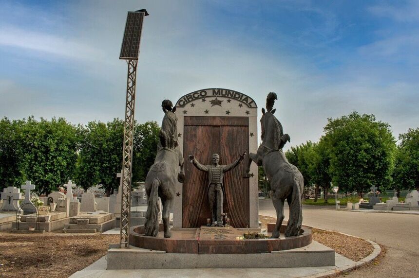 Sin duda alguna, pasear por un cementerio y encontrarse con esta grandiosa obra, crea cuanto menos curiosidad y asombro. Además de su majestuosidad, la sepultura tiene otra particularidad, está dotada de una columna con placa solar que hace que todo el conjunto se ilumine por la noche, como si se encendiesen nuevamente las luces del circo y el espectáculo continuase.