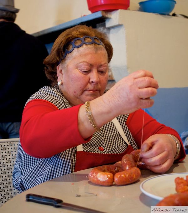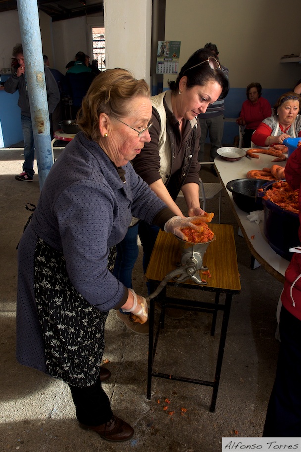 El ritual comenzó el miércoles pelando la cebolla (seis sacos) para después cocerla y a continuación colgarla en un saco de arpillera para que escurra toda el agua. Al día siguiente los hombres sacrificaron los cerdos, los pelaron y los dejaron limpios; sacaron las tripas y los colgaron al sereno toda la noche en canal abierto. Sobre las ocho y media de la mañana, los bajaron para deshacerlo, es decir sacar las partes del cerdo y preparar la carne para picarla.